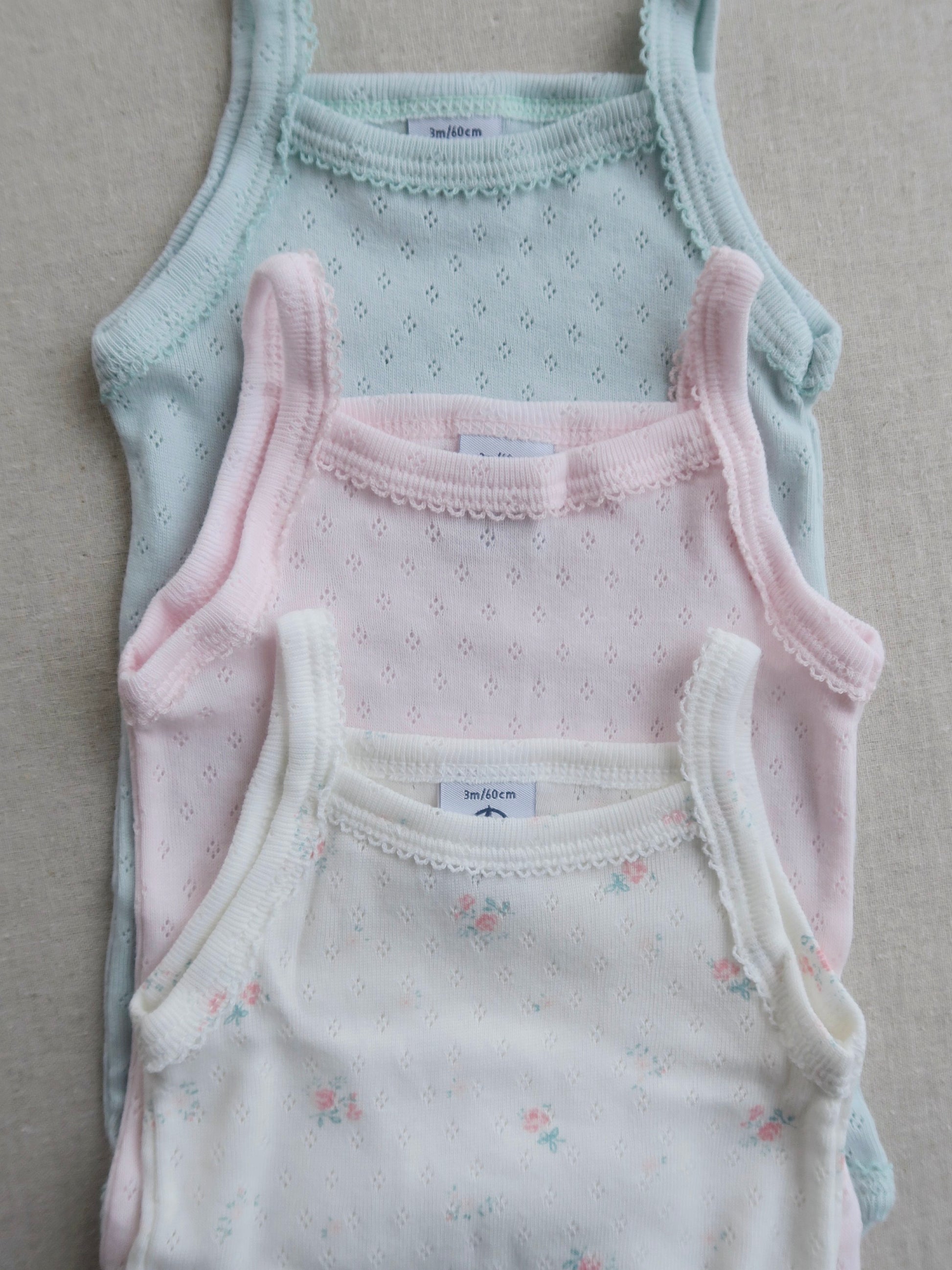 3 bodies in the iconic Petit Bateau cotton. This pack includes a body in solid white with red text, a body in navy/white stripes and a body with a cute heart print.