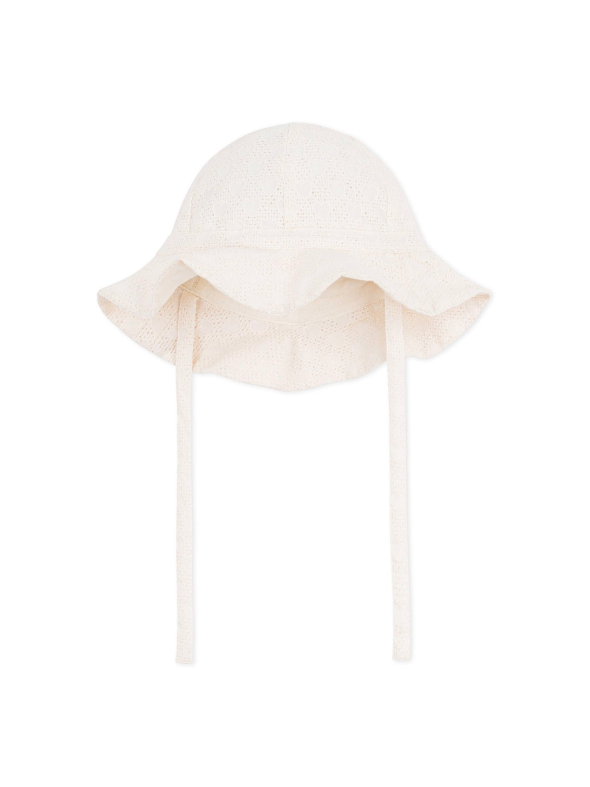 A cute and feminine summer hat in a cute embroidery with ties.