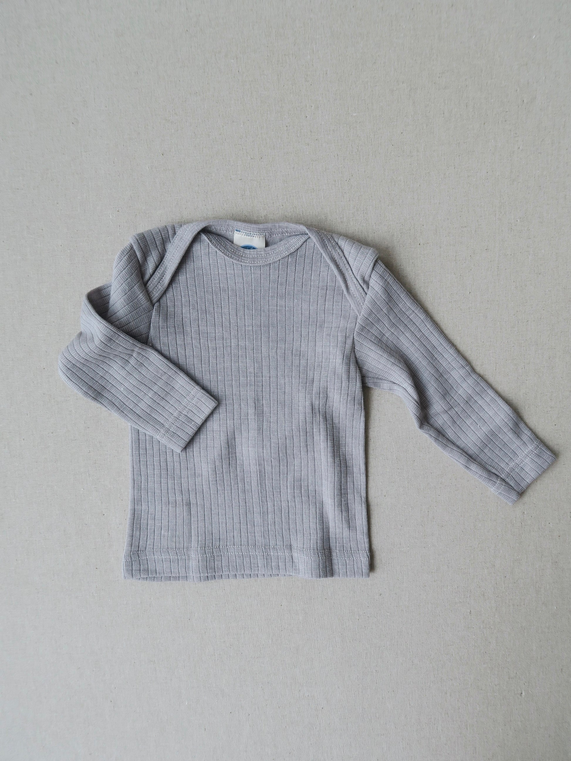 Blusen har ribstruktur og består af en blanding af uld, silke og bomuld. Blandingen er perfekt til den lille størrelse med sart hud, da huden let kan ånde og regulere sig i forhold til temperaturen.