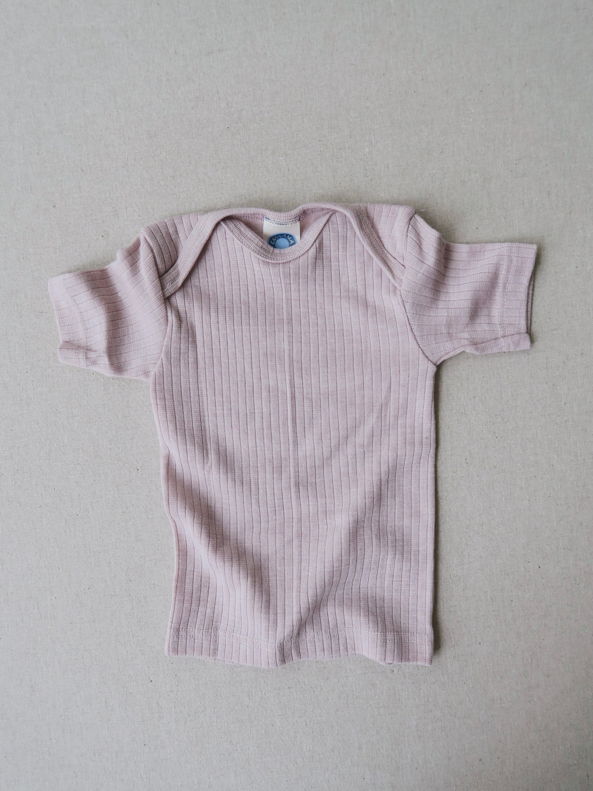 Blusen har ribstruktur og består af en blanding af uld, silke og bomuld. Blandingen er perfekt til den lille størrelse med sart hud, da huden let kan ånde og regulere sig i forhold til temperaturen.