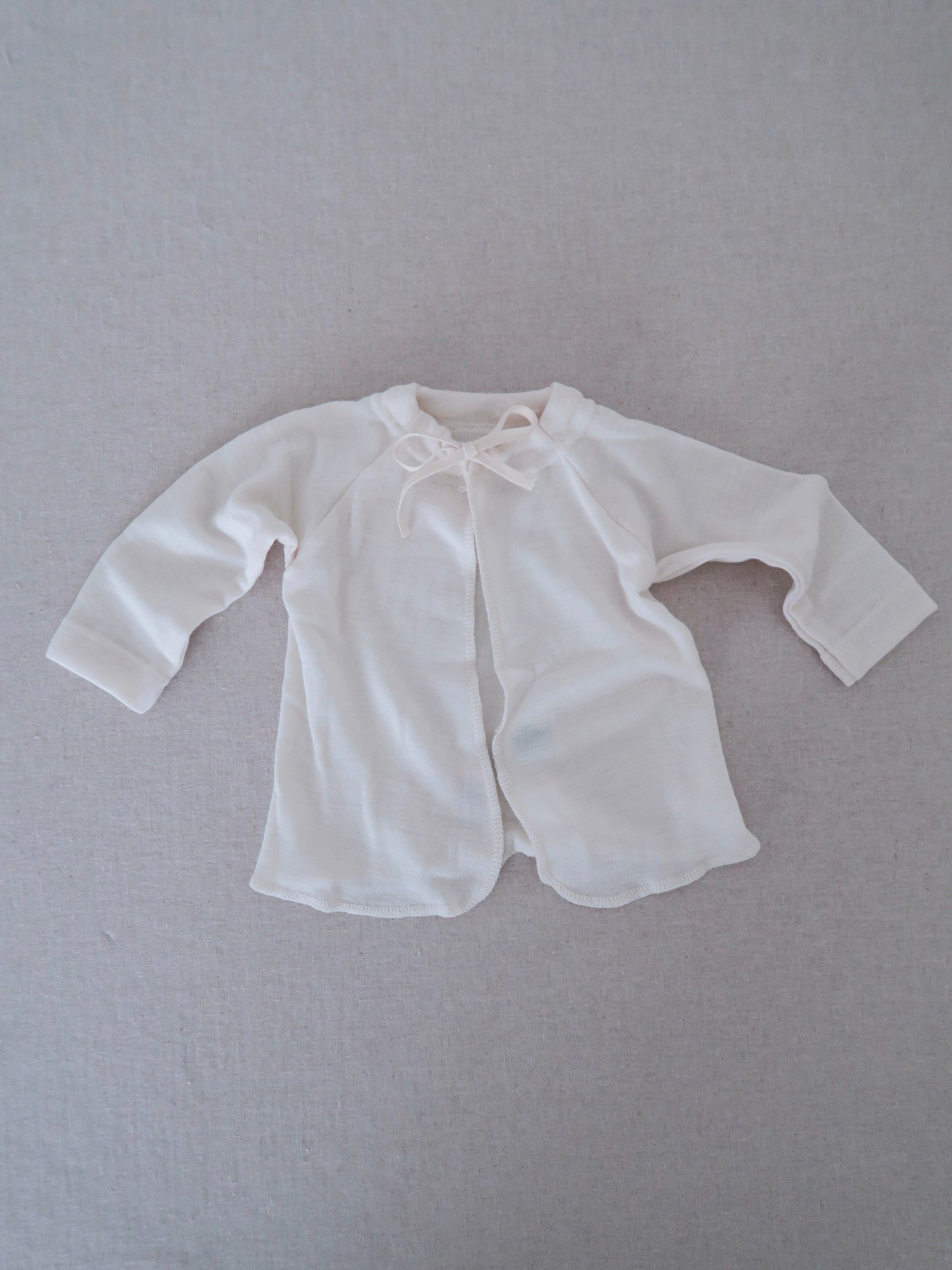 Blusen holder det lille barn varm, men da den er tynd i kvaliteten fylder den ikke for meget på den lille krop - perfekt til en lille baby. Den lukkes enten foran eller bagpå med et lille bindebånd.