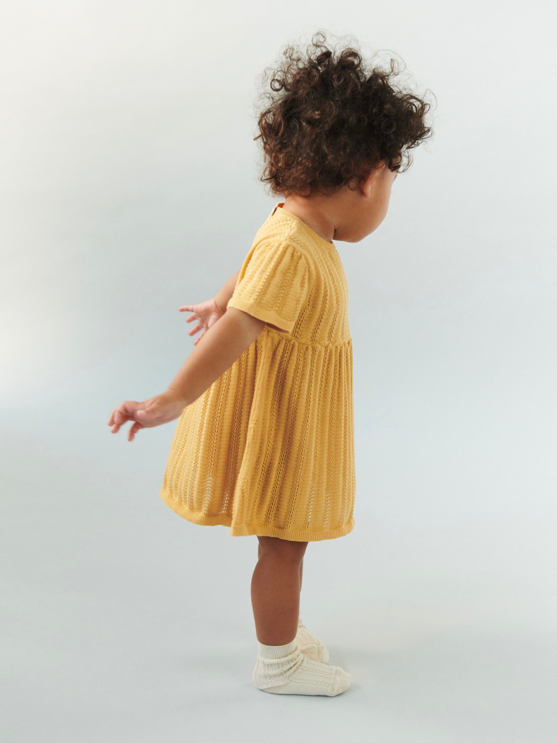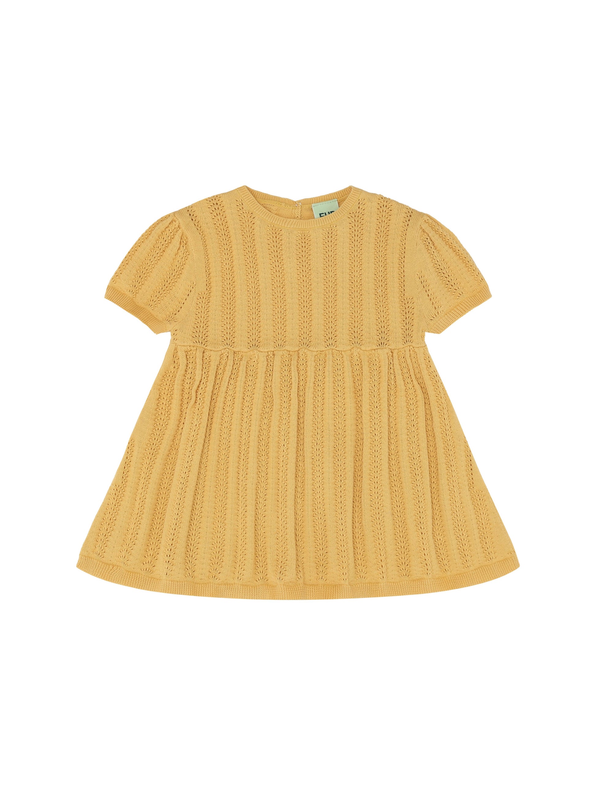 Denne kortærmede babykjole er strikket i en dekorativ pointellestruktur med smalle ribkanter og små bløde læg i taljen, der giver skørtet volumen.